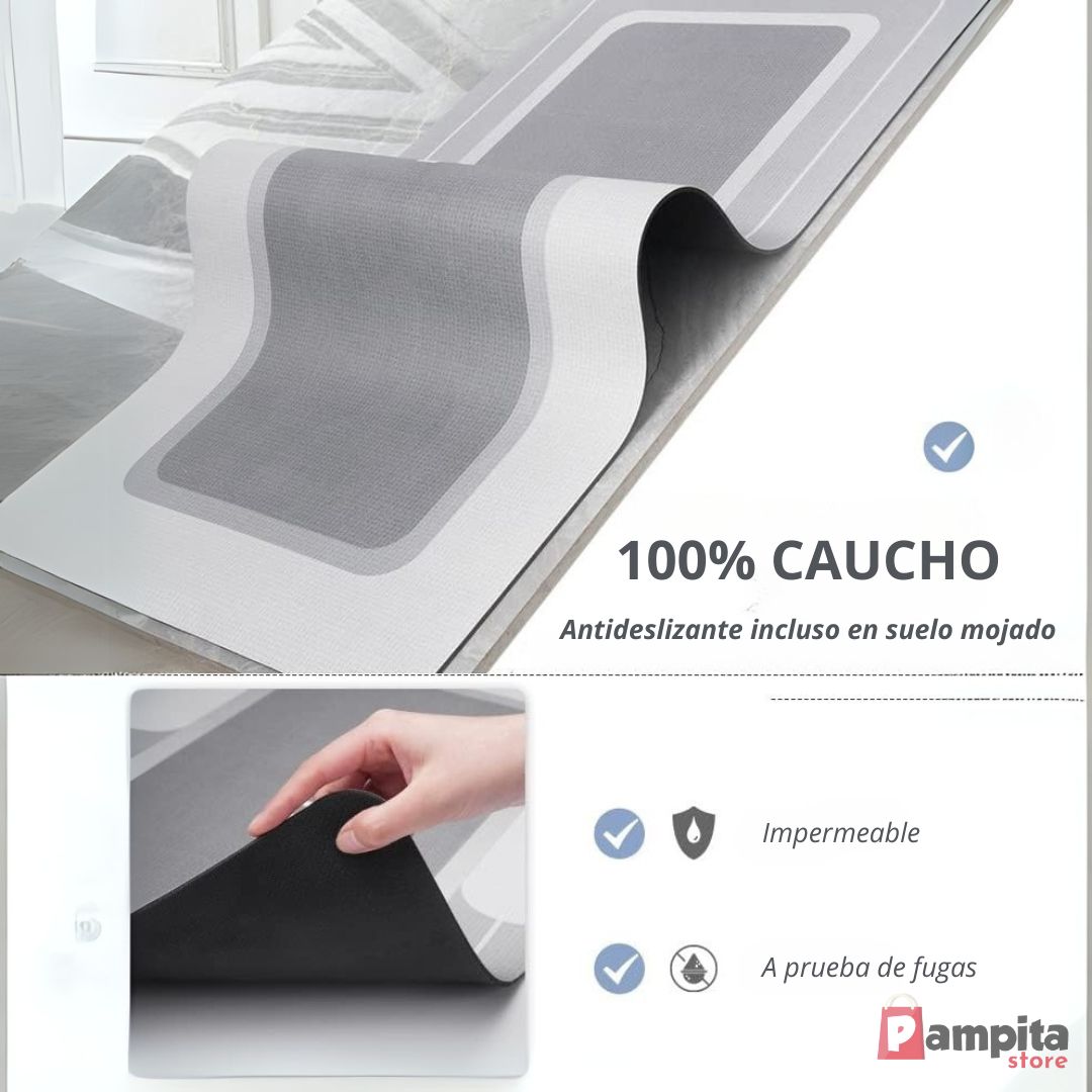 Su respaldo de goma de alta calidad asegura estabilidad incluso en superficies húmedas, ideal para hogares con niños o adultos mayores.